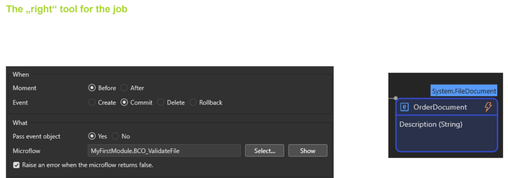 Mendix provides a built-in interception mechanism through Before Commit event handlers on entities that inherit from FileDocument. These handlers allow logic to run just before a file is persisted.